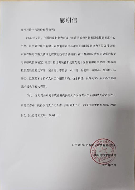 這一封封來自國網(wǎng)省級單位的感謝信,既是對萬特技術(shù)實力的權(quán)威認(rèn)證,更是對公司在電力競賽標(biāo)準(zhǔn)化服務(wù)領(lǐng)域的深度認(rèn)可。從山西的采集運(yùn)維到湖北的智能電表接線,從河南的反竊電分析到冀北的省級技能鑒定,四省差異化賽事需求的成功交付,是基于公司近二十年服務(wù)國家級賽事的經(jīng)驗積淀,印證了公司在各類電力技能競賽中具備相當(dāng)規(guī)范化、標(biāo)準(zhǔn)化的專業(yè)能力。