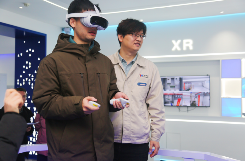 交流期間,來訪嘉賓首先走進(jìn)萬特電氣產(chǎn)品展廳,近距離觀摩公司前沿的電力仿真培訓(xùn)設(shè)備,并沉浸式體驗(yàn)高空墜落體感裝置、電力安全VR體感裝置、人體觸電體感設(shè)備、電弧灼傷體感設(shè)備等系列互動產(chǎn)品,對萬特電氣將VR/AR/XR 等數(shù)字技術(shù)與電力培訓(xùn)深度融合的創(chuàng)新模式予以高度認(rèn)可。