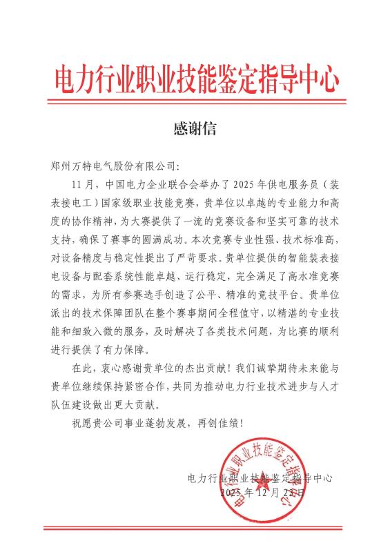 信中,電力行業(yè)職業(yè)技能鑒定指導(dǎo)中心對萬特電氣“卓越的專業(yè)能力和高度的協(xié)作精神”表示高度肯定。